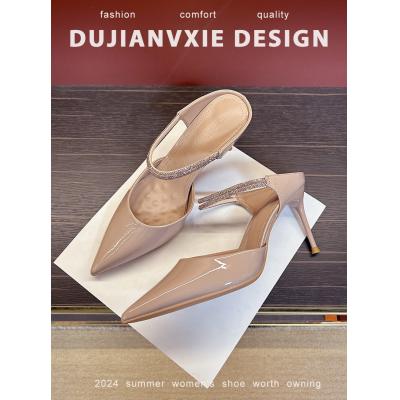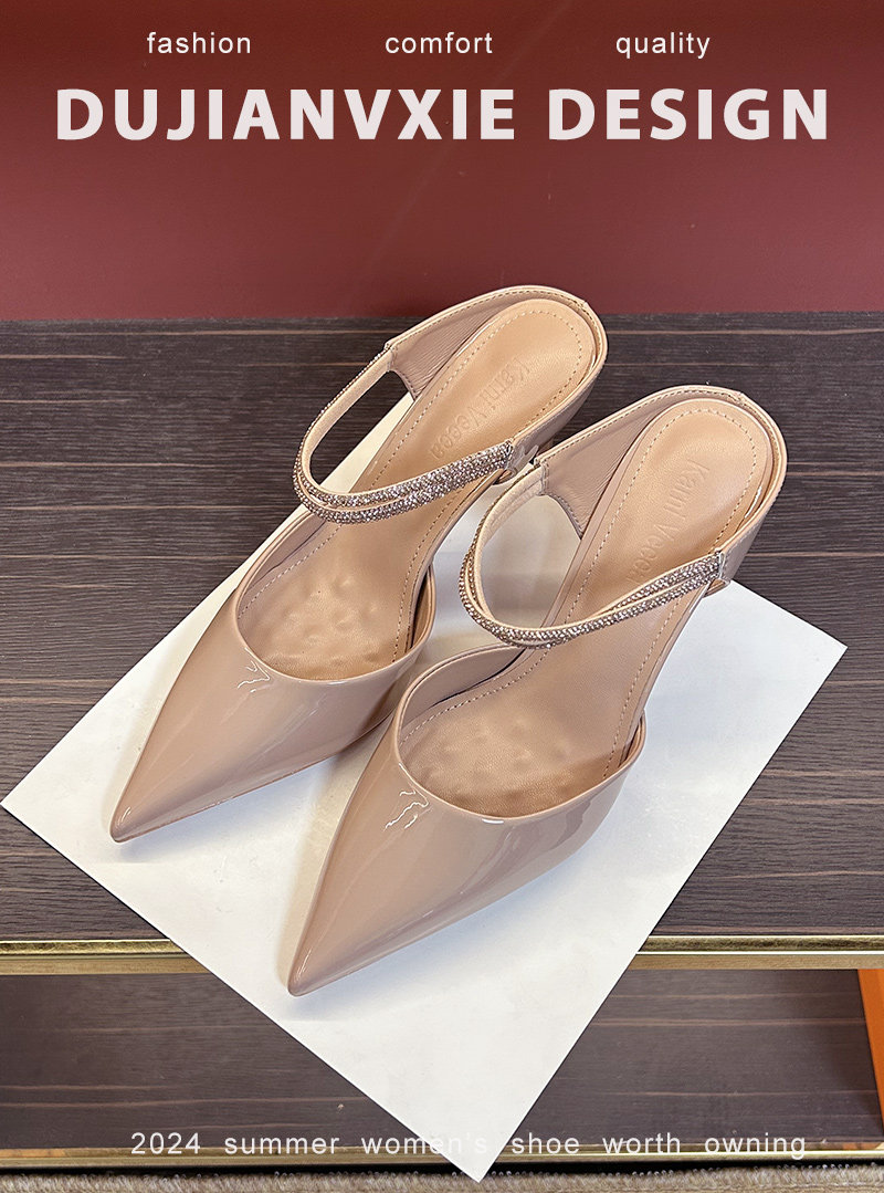 2025年新款裸色漆皮细跟高跟鞋女尖头凉鞋时尚气质百搭水钻拖...